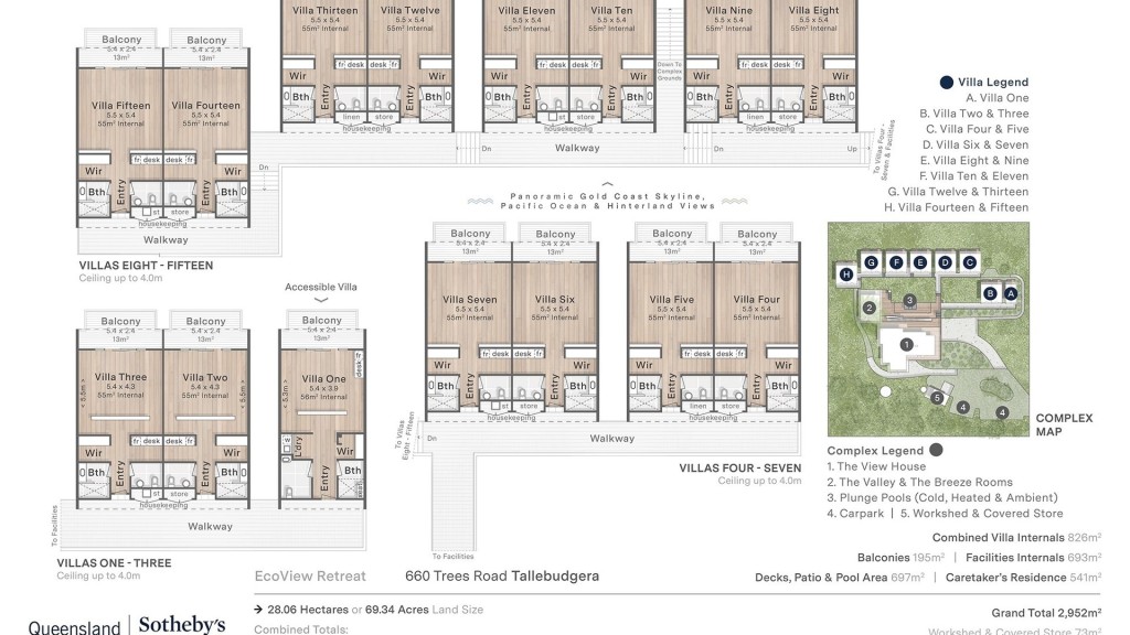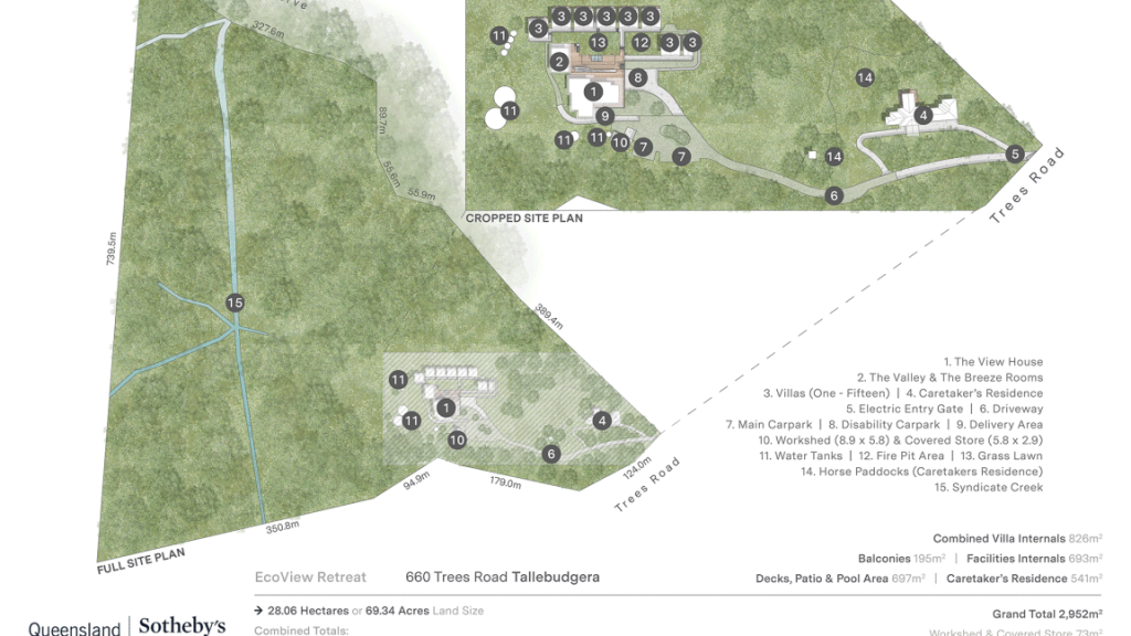 28.06 hectares of elevated hinterland with sweeping valley and coastline views. Purpose-built wellness and event facilities with commercial kitchen, dining hall, and multipurpose spaces. 15 self-contained villas each with balcony and ensuite. 5 multi-purpose spaces that can be adapted for a range of uses, including accommodation, treatment rooms, and more. Separate caretaker's residence and full supporting infrastructure. Architecturally designed for seamless indoor-outdoor flow. Operational business ready for brand expansion or repositioning. Prime Tallebudgera Valley location, 15 minutes to Burleigh Heads, 20 minutes to Gold Coast Airport, and 60 minutes to Brisbane Airport.